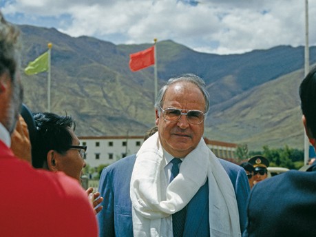 这张照片转自德文网站。图说(苏晓琴翻译)写到:“与权力同行(图集标题)——不是的,科尔在1987年7月访问西藏时并没有感冒。那条漂亮的生丝围巾是西藏自治区政府主席送给他的问候礼物。据曾经陪同科尔总理的Mainhardt Graf von Nayhauß先生回忆,‘当三名身着民族服装的漂亮藏族女孩上前,想从一把装饰精美的壶中为总理斟上青稞酒时’,科尔却因为‘忙着跟人握手’连看都没看。”