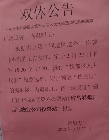卷烟厂“双休办”则对已领选民证的双休人员逐一电话通知,要求他们按时到第六投票站去投票。