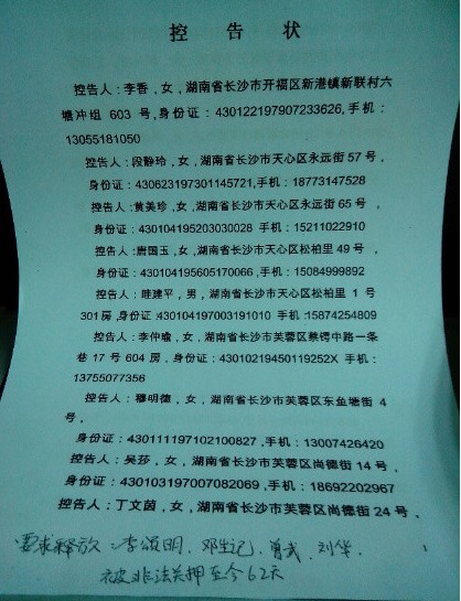 (维权网信息员李军报道)本网此前报道,2012年11月,长沙吴莎、李香等17名上访维权人士在北京旅游时被非法绑架回长沙,刘华、李颂明、曾武、邓生记等人因为去接17人而被以危害安全罪逮捕。