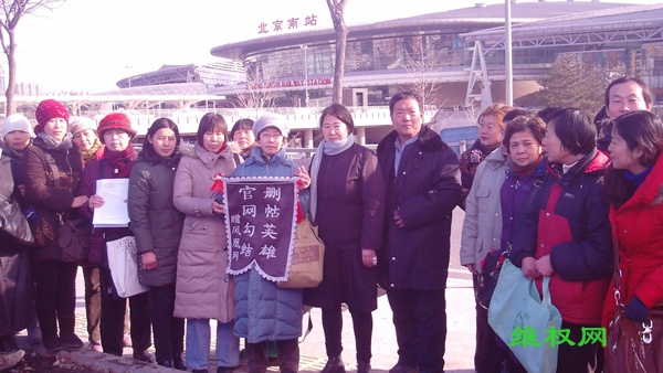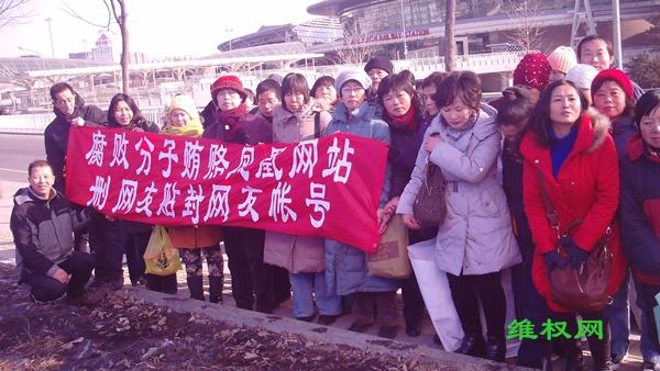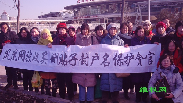 (维权网信息员田静民报道)1月8日,数十名各地上访维权人士因凤凰网无故大量删除反腐维权的帖子、封用户名而抗议,并为凤凰网制作了一面“删帖英雄,官网勾结”的“锦旗”。