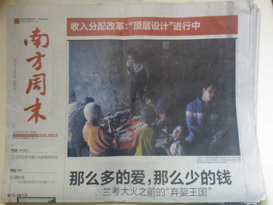 星期四是《南方周末》的正常出报日。1月10日是2013年的第二个星期四,早上6点30分, 第1508期《南方周末》便被送至上海浦东陆家嘴街头的一个报亭。
