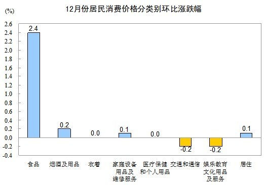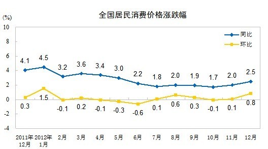 国家统计局发布数据,去年居民消费价格(CPI)同比上涨2.6%;其中,12月CPI同比上涨2.5%,创下6月份以来的半年新高。去年3月份两会政府工作报告制定的目标是,居民消费价格涨幅控制在4%左右。