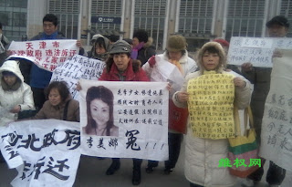 另一名天津上访维权人士高相林,因抗议强拆被警方抓捕,案件在天津市南开区法院开庭审理时,近三百人到现场围观,他们高举“高相林无罪”的标语声援高相林,但高相林的罪名却是“聚众扰乱办公秩序”,被法院判刑4年。高相林的妻子杜艳萍再次手举“高相林无罪”的标语前来参加抗议。