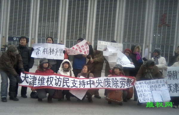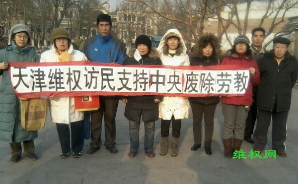 (维权网信息员田静民报道)1月16日,天津近40名上访维权人士打横幅,支持废除劳教恶法,并呼吁释放因上访维权被劳教的赵彦勇等人。