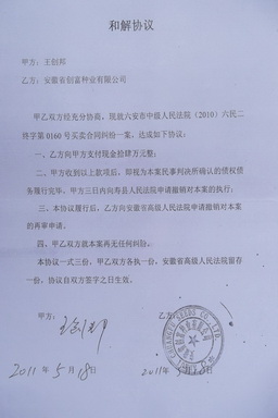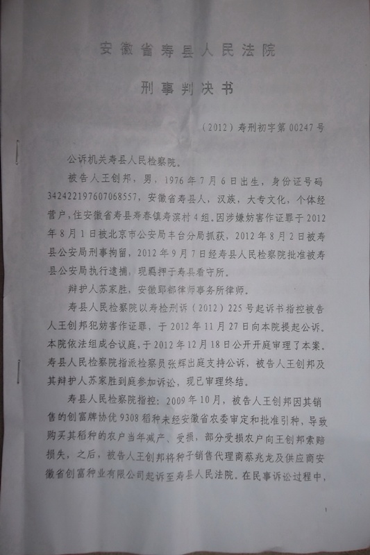王创邦2009年因销售“创富”牌协优9308水稻种子致农民减收,为获得赔偿而将种业公司告上法庭,历经寿县、六安两级法院审理、判决,并经安徽省高级法院协调于2011年5月18日达成和解协议,拿到全部赔偿款。