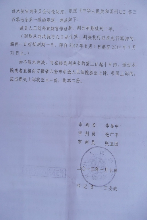 (维权网信息员周维林报道)本网信息员获悉,安徽省寿县维权人士王创邦于2013年1月10日被寿县法院以“妨碍作证罪”判处有期徒刑二年。据王创邦妻子孙自慧称,王创邦对此判决不服,认为太冤。