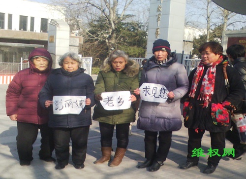 (维权网信息员张宁宁报道)1月16日早6点许,山东省临沂拆迁受害人刘国慧、秦玉玲、魏兰玉(62岁)、王汝兰(71岁)、杨自娥、卢秋梅等人到解放军艺术学院门口,打出“彭丽媛,老乡求见你”的标语。