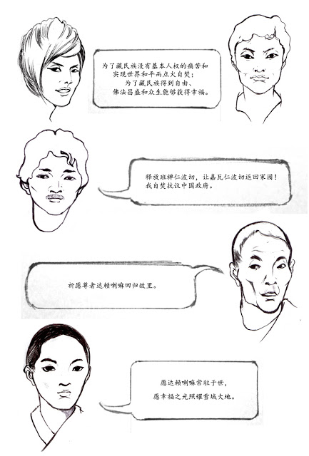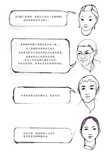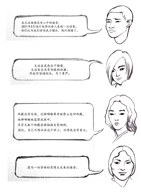 我与他虽不相识,却因这些绘画、动画短片而结缘。在我们的通信中,他解释在做自焚藏人肖像邮票的动画短片Talk about Tibet – Last words 自焚的面孔时:“忠言逆耳,可能需要优美的线条和幽默的气氛来软化……”所以,这部动画短片的结尾加上了10秒的真实视频:动画与真相,更有力量。其实这真的很重要,不只是愤怒与痛苦,还需要美的再现。