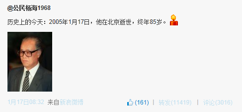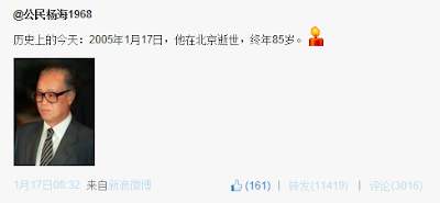 民间学者杨海先生于1月17日早上8点32分发出的纪念赵紫阳并附有其照片和纪念蜡烛的微博:“历史上的今天:2005年1月17日,他在北京逝世,终年85岁。”此微博一经发出,即被迅速转发,在24小时内直接转发超过11400次,评论则超过3000次。到发稿时依然安在。