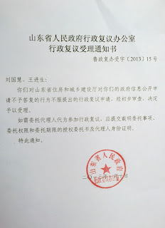 (维权网信息员方芳报道)元月15日,山东临沂拆迁受害人刘国慧和王进生收到山东省政府行政复议办公室《鲁政复办受字【2013】15号行政复议受理通知书》。