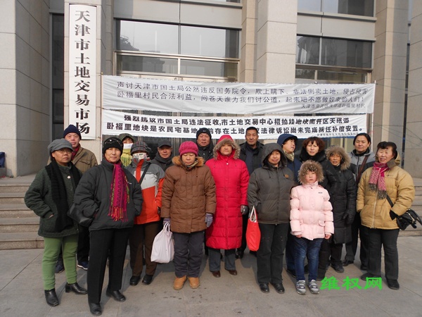 (维权网信息员侯原民报道)本网信息员得到天津维权人士提供的信息,元月17号,天寒地冻,天津南开区卧福里村民继续到天津国土局举行抗议活动,这已经是第53天连续抗议了。村民们抗议国土局非法将卧福里村民的宅基地卖给了“地王”。(此前曾在维权网做过报道)卧福里村民们在没有得到补偿款的情况下,自己赖以生存的房屋被政府野蛮强拆,并抓捕了几个维权的村民。