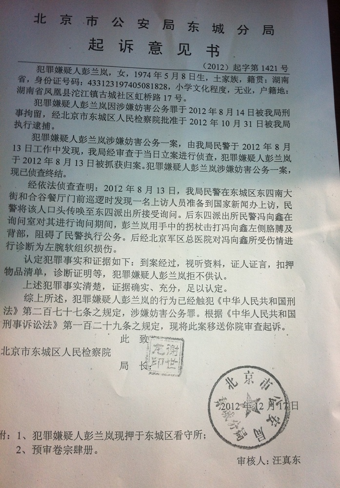 东城公安分局的起诉书中指:2012年8月13日,我局民警在东城区东四南大街和合谷餐厅门前巡逻时发现一名上访人员准备到国家新闻办上访,民警将该人口头传唤至东四派出所接受询问。后东四派出所民警冯向鑫在询问室对其询问期间,彭兰岚用手中的拐杖击打冯向鑫,阻碍了民警执行公务。起诉书中又指:犯罪嫌疑人彭兰岚拒不供认。