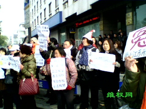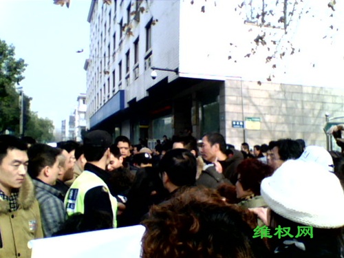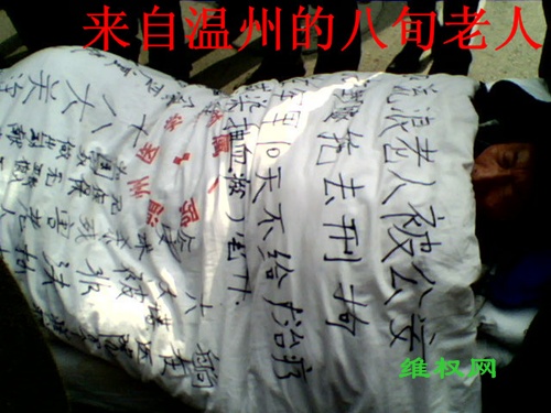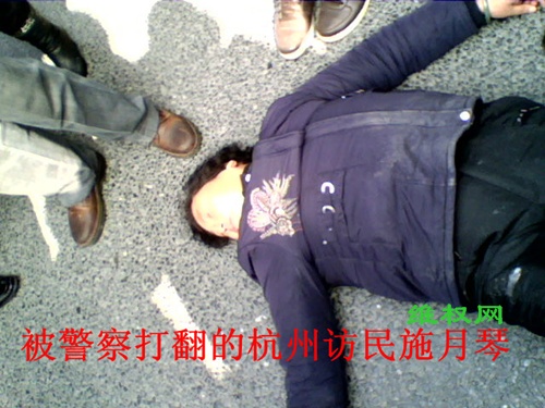 一位来温州的75岁的大妈,拉着一辆简易平板车,车上躺着她80多岁的老伴,试图进入人民大会堂,但被警察阻住。这位老大爷几年前被当地公安打伤,上访多年无果,于是只好不远千里来省府向人民代表求救。另一位杭州上访维权人士施月琴试图向人民大会堂走过去时,被警察打翻在地。警察打了人以后,就跑到车子上躲起来了,当时被很多上访维权人士拦住,可后来,一转眼又跑了。