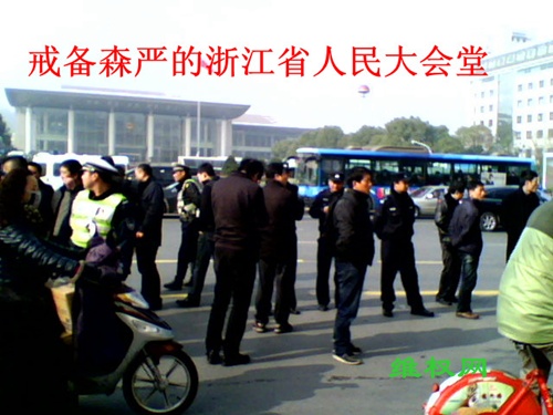 (维权网信息员张山峰报道)浙江省十二届人大一次会议于1月25上午在浙江省人民大会堂开幕,上千名上访维权人士涌向人民大会堂。虽然当局称“为最大限度减少对人民群众正常工作生活的影响,会议期间将不封路、不管制”,但实际上并没有做到,上访维权人士仍被限制在人民大会堂对面的环城西路东侧,而近千名警察和保安则守在人民大会堂的周围,防止上访维权人士进入人民大会堂。下午,来了几辆工程车,在通向人民大会堂的入口处设置了栏杆和其他障碍物。