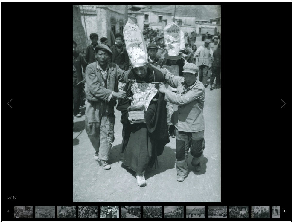 Men drag the monk Rempu Rimpoche through the streets of Lhasa. After the Cultural Revolution ended in 1976, Rempu fled to India. In 2006, Woeser confirmed that the then-80-year-old monk was still alive, and living in New York.