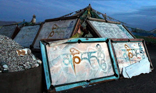 | 这篇给RFA藏语节目的文章,写于去年8月-12月我从北京回到拉萨期间,记录的是在途经格尔木时去探访“曲麻莱县三江源生态移民村的见闻,过去的台球桌而今被写上经文、改成嘛呢石安放在经幡丛中,这给我留下了深刻的印象。 |