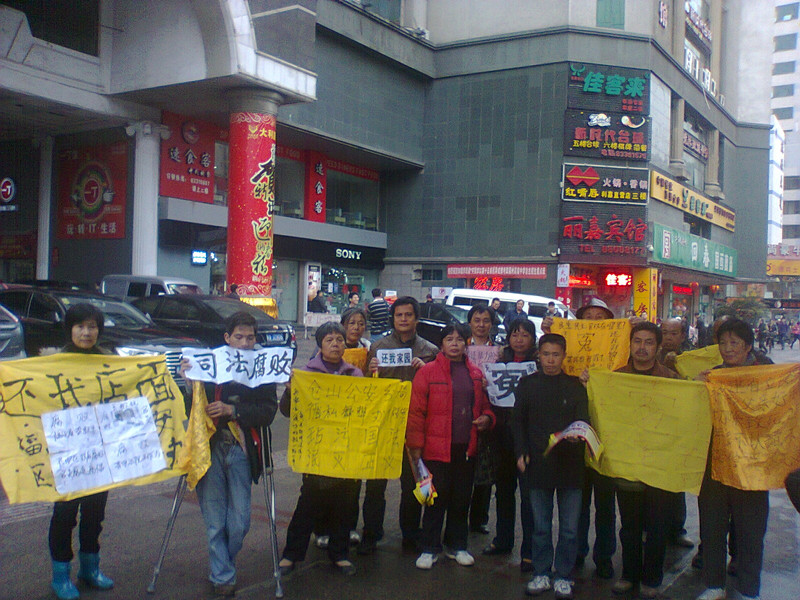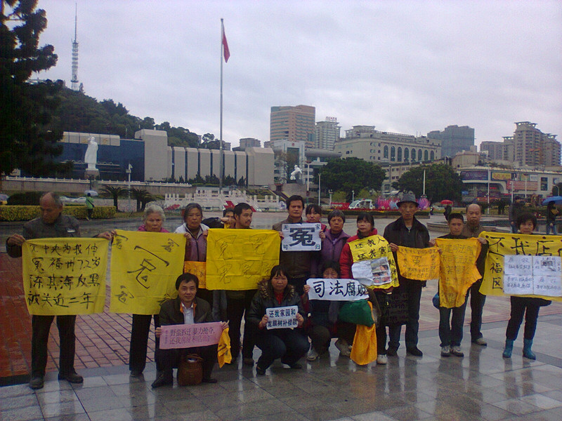 (维权网信息员任长霞报道)今天(2月3日)是周日,适逢小年,是福州众冤民每周一次集体吐苦水诉冤情的日子。虽然福州今天早上天空不作美,但还是有近20位冤民冒雨来到福州市中心的五一广场参与诉冤情活动。