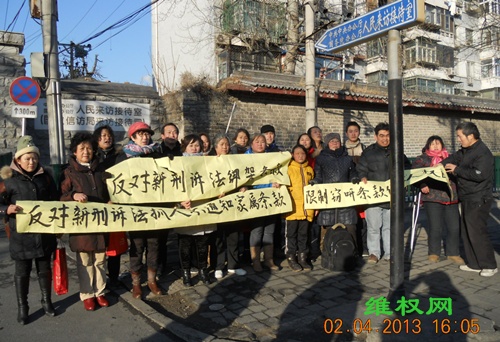 (维权网信息员李军报道)2013年2月4日下午,刘沙沙等多位维权人士们在北京永定门西街甲一号、全国人大信访办门口拉起横幅,呼吁要求新刑诉法取消“绑架条款”,限制“窃听条款”。
