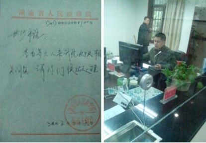 2月6日,李香等人又来到省检察院要求就非法拘禁的事件立案,周卫权处长批了一张条子,让大家到长沙市检察院去,就再无人理睬了。李香等人上个月已经送了材料,可到现在还没有立案或不立案的答复,只在省、市检察院之间踢皮球,相互推诿。