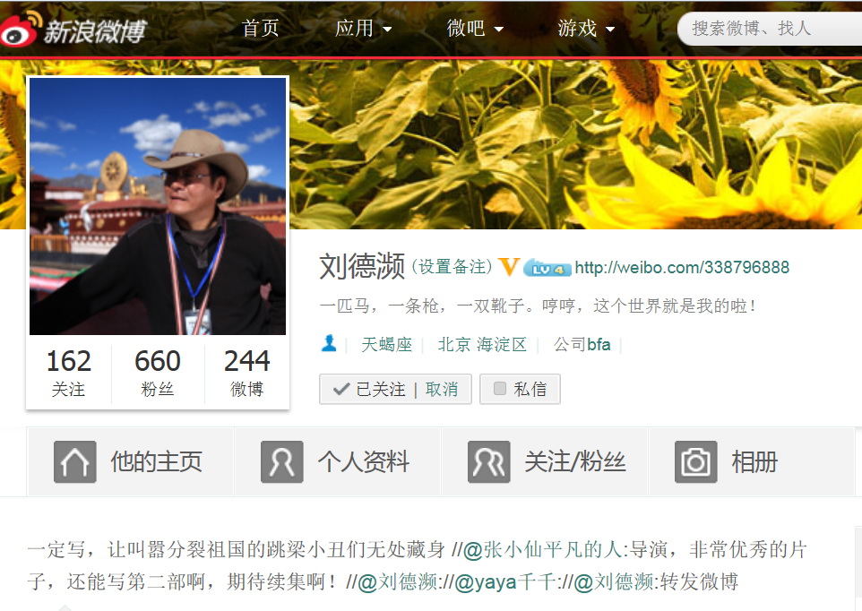 | “你们这些朋友也就过过嘴瘾,让党把你们制得服服帖帖的,见到武警就爬地下了,还嘴硬呵呵,西藏我还是会去的,那么美那么圣洁的土地。但你们敢不敢来内地就不知道了,到内地没人惯着你啦!还张嘴闭嘴威胁谁呵呵笑话,天下还是共产党的朋友!”——《西藏秘密》扮演“堕落活佛”的演员刘博皓的微博。 |