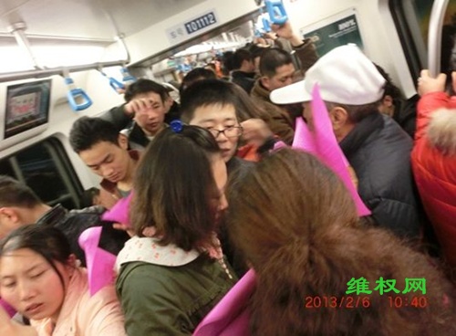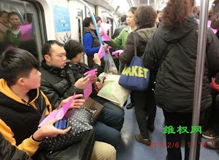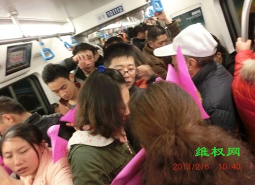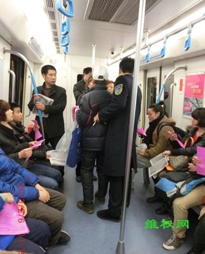 (维权网信息员陈华报道)2月6日上午10点钟,成都的1、2号地铁线上几个班次的车厢内,分别有五、六位大妈大叔向乘客散发关于要求中国最有权力的205名部级以上官员公开财产的《公民建议书》。大叔大妈一边散发建议书,一边对乘客说:“我们响应习主席号召,帮助共产党反腐败,要求官员公示财产,也是对官员的保护,行使公民的权利。”乘客们见此,纷纷抢看建议书,并投以赞许的目光,还有乘客帮助散发。一小伙子拉着散发建议书的大爷说:“我要跟着你们一起散发,让更多的人投入到这个活动中来。”一时间,车厢内,到处是红黑相间的建议书。不久,上来了警察,将散发建议书的大叔大妈赶下地铁,:“不准散发”。大叔大妈下了地铁,又上了另一节车厢,地铁车厢内又不断的上来警察,阻止散发建议书,并威胁大叔大妈。