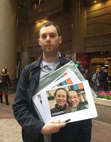 2月10日(春节)下午两点左右,@feng37和刚刚从内地来到香港的@oubiaofeng到达香港铜锣湾时代广场,开始“声援刘霞刘晓波初一行动”。他们向过路游客征集在刘霞刘晓波大图上签字拜年,分发了近百张刘晓波刘霞夫妻钱包小图,图上有他们家地址。