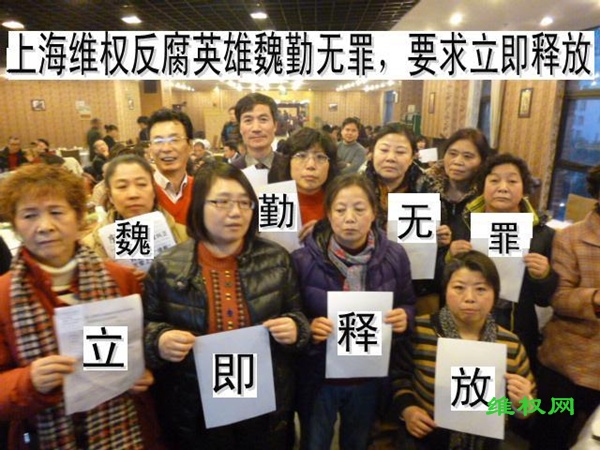 大家手持强烈要求释放魏勤、崔福芳、童国菁、王扣玛、沈咏梅、沈莲满的标语,要求习近平以实际行动依法治国保障人权。