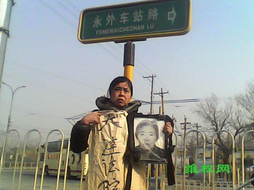 获得自由后的王春梅孤身一人伫立在北京永外定路的路标下,一手抱着母亲的遗像,一手持着“大连法院”的纸牌,一脸悲楚,发出无声的抗议,却是此时无声胜有声。