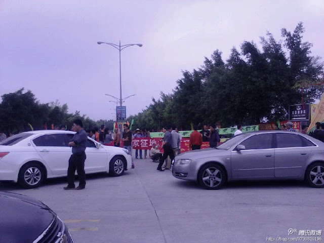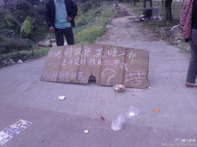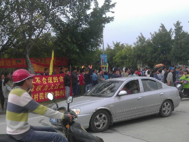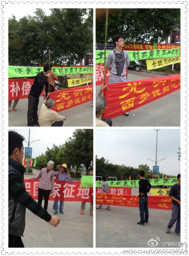 村民拉起多张大横幅, 上面写着:「终止不合理的合同 废除权力大过法律 还我村民权力」、「追究国家征地补偿款项」、「还我土地」等,并敲锣打鼓大肆张扬,