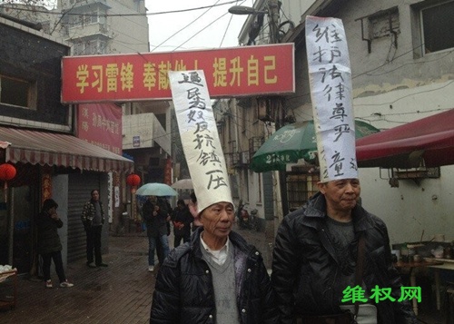 (维权网信息员华新报道)2月14日,武汉公民童斌和一位同伴,带着二顶标语帽走上街头抗议腐败。童斌认为,由于长期专制,中国人性的私恶程度,已经达到巅峰状态。而民众由于长期受到集权专制的野蛮统治,已经像奴隶一样战战兢兢,不敢表达任何政治观点。