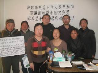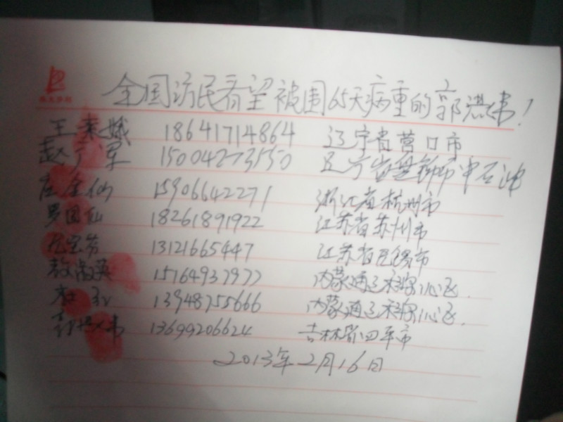 2013年2月16日下午时分,各地的在京访民王素娥、赵广军、左金仙、罗国仙、杜红等七名访民得知消息,冒险前来看望郭洪伟,并且和郭洪伟一起合影留念,声援郭洪伟,表示对围困郭洪伟黑恶势力抗议,遣责北京八角派出所的不作为和包庇。