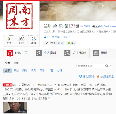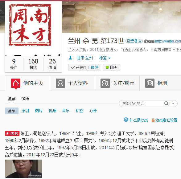 (维权网信息员赵小明报道)兰州著名维权人士、2011年人大代表独立参选人余男先生因在网上发起关注中国在押政治犯刘贤斌、陈卫的活动,今日(2013年2月18日星期一)遭新浪连续封杀两个微博号。