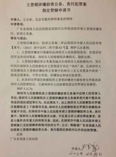 (维权网信息员赵小明报道)备受关注的深圳警官王登朝案自王全章和刘晓原律师接手后,出现了一些最新进展。王登朝的代理律师王全章认为深圳中院不适合审理王案,并递交要求高院指定深圳以外法院管辖该案的申请书。