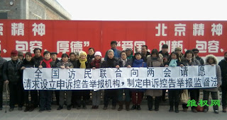 (维权网信息员田静民报道)2月21日,来自全国各地的上访维权人士聚集在北京,一起向全国“两会”请愿。请求设立申诉、控告、举报监督机构,制定《申诉、控告、举报监督法》,废止《信访条例》。