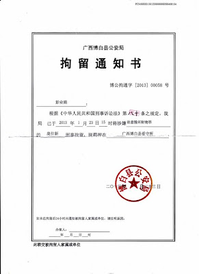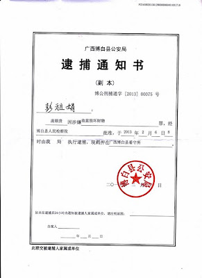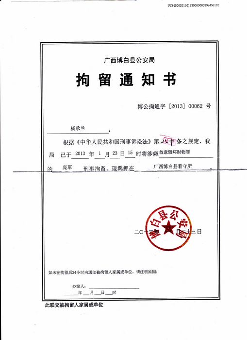 1月25日下午4点钟,涉案人亲属才收到博白公安局寄来的刑事拘留通知书,罪名是:“涉嫌毁坏财物罪”,于2月6日被博白检察院批准逮捕,6日早晨8点博白公安局正式执行逮捕。