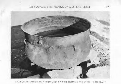 英国人摧毁了弱小的图伯特军队,并且破坏了拉萨政府,这在图伯特造成了一个权力真空。这一权力真空随着英国军队的匆忙撤退而更加恶化。在第二年,即1905年,精力充沛而又冷酷无情的满清四川总督赵尔丰,入侵并占领了图伯特东部的大片地区,烧毁了很多寺院,屠杀了数千名僧人,并且有步骤有计划地灭绝了许多在图伯特与中国边界地区古已有之的独立和半独立的图伯特地方统治者(即中文所称的“土司”——译者)的传承系统。康区民众受到中国军队的恐怖统治。我曾经在一本旧的《国家地理》杂志上读到一篇目击者关于中国人的暴政的文章[II],作者是美国传教士艾尔伯特•希尔顿博士(Dr Albert Shelton)。希尔顿写道,中国士兵在察雅(Drayak)寺,用通常僧人们集会时熬茶的大铜锅将康巴们活活煮死。文章还提供了那口大铜锅的照片。