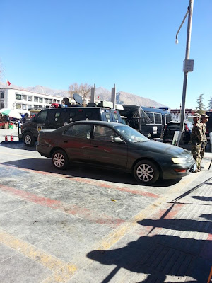 4、安多拉卜楞寺(今甘肃省甘南州夏河县),举办展佛等法会的场面之一:军警站满长长一排。据游客告知:“荷枪实弹的军警把法会外围的山头都围满了”: