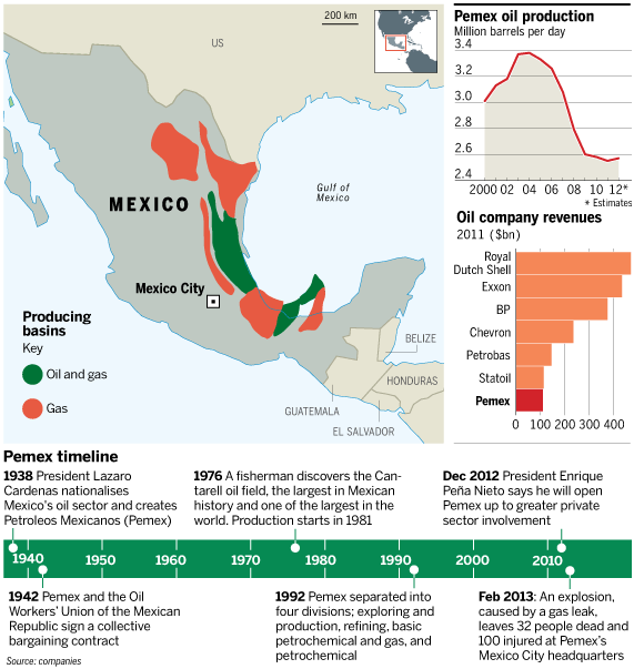 此前被墨西哥保护主义的能源政策挡在门外的大型石油公司——如埃克森-美孚(Exxon-Mobil)和荷兰皇家壳牌(Royal Dutch Shell)——已表示,如果墨西哥议会通过各方期待已久的改革提案,它们准备投资。