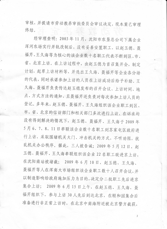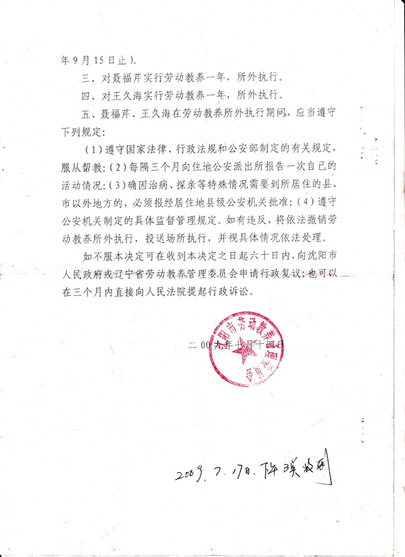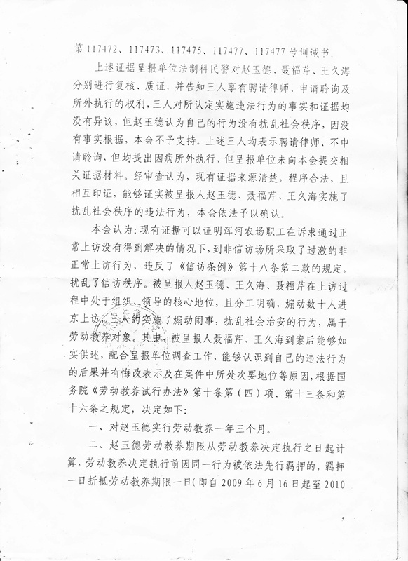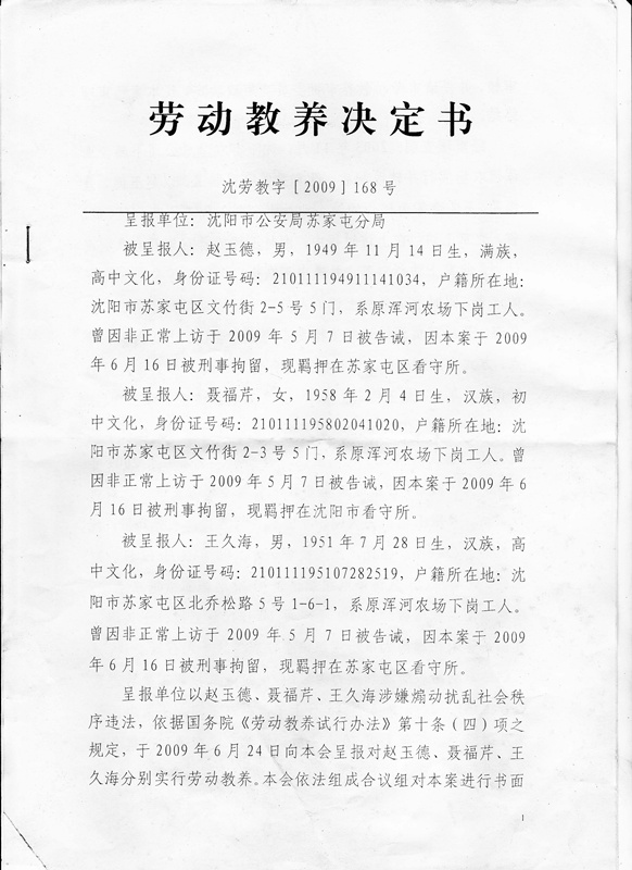 沈阳市苏家屯公安分局以赵玉德、聂福芹、王久海三人涉嫌煽动扰乱社会秩序为理由,将赵玉德处以劳教一年三个月,2009年6月16日至2010年9月15日。而聂福芹、王久海则处以劳教一年,所外执行。