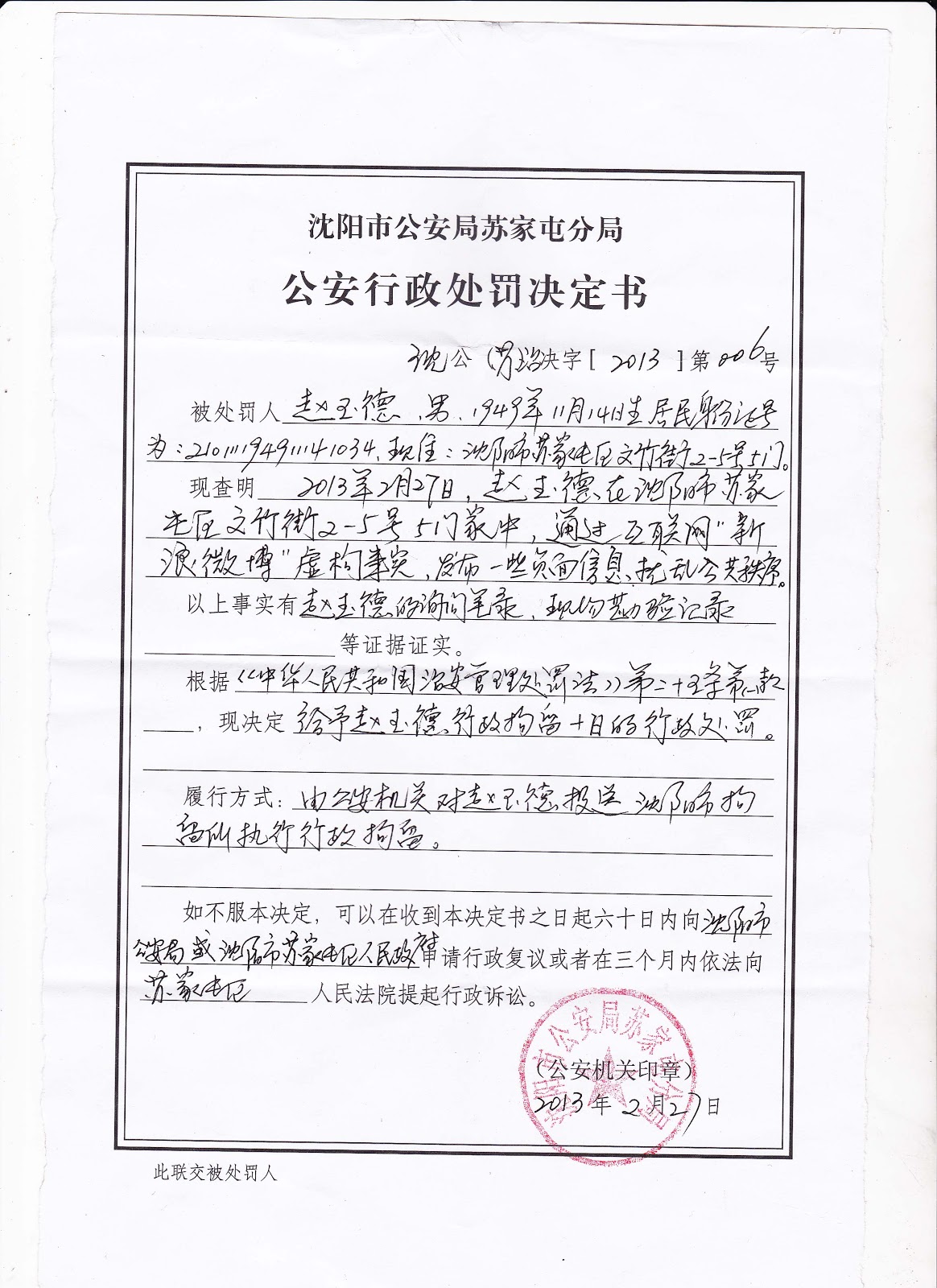 苏家屯公安分局给赵玉德的行政处罚决定书:2月27日,赵玉德在自己家中,通过互联网在新浪微博“虚构事实”,发布一些负面信息扰乱公共秩序。