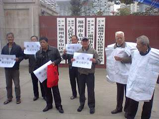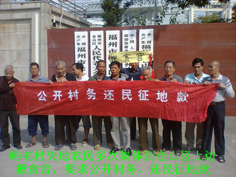 屿宅村失地农民为了维护切身合法权利不受侵害,集体强烈要求公开村务,还民明白账!依法征地依法补偿,惩治侵吞他们征地款的镇、村官员。可事与愿违,就是在习八条和“老虎苍蝇都要打”颁布后,仓山区官员以及盖山镇官员仍在包庇腐败,根本不管屿宅村失地农民死活!