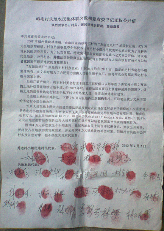 2008年福州修建林浦路,仓山区盖山镇屿宅村的“友谊造纸厂”地块被征用。974万元征地款却被镇、村官员强取豪夺全部侵吞。秀宅村小组村民代表和失地农民为了维护失地农民的切身利益,为了反对贪腐,特此集体联名致福建省省委书记尤权公开信,请求还民征地款,并依法惩处隐藏在征地拆迁背后的拆迁办人员和镇村官员相互勾结套取国家巨额征地款的腐败现象!