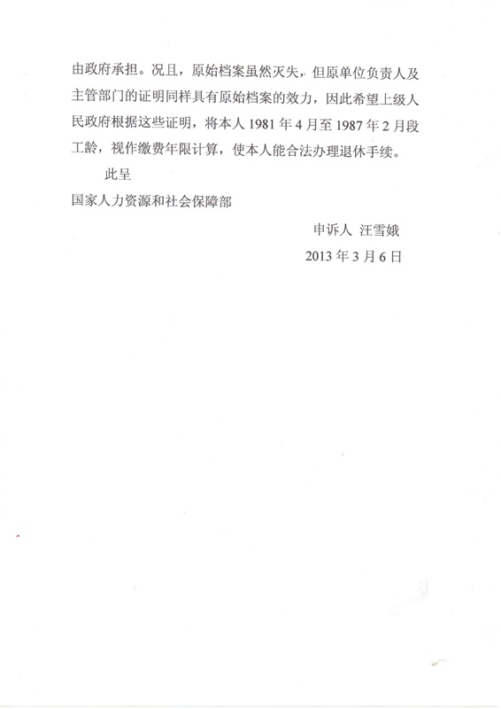 汪雪娥原系浙江省临安国营临安丝绸总厂工人,1981年4月至1989年4 月在该厂绸部作织绸挡车工。后该厂转制、破产,在转制过程中厂劳动人事档案被毁,她在该厂1981年4月至1987年2月的劳动档案也随之灭失,致使其1981年4月至1987年2月期间尚未实施劳动保险金缴纳制度前的工龄未能计入工龄缴费年限。关于这段时间的工龄,有国营临安丝绸总厂的主管部门临安市经济发展局、临安市总工会及原厂党委书记高家仔、原厂党委副书记兼工会主席钱森炎和原生产副厂长叶文明等予以证明。但她在办理退休手续时,受理方(杭州市西湖区社险办)以没有原始档案为由不予办理。为此,汪雪娥自2011年3月以来一直上访申诉,但有关部门相互推诿,至今未能解决。