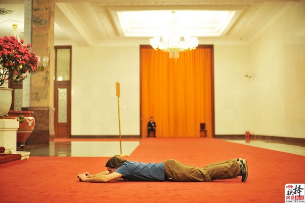 - 3月7日,北京,人民大会堂内一位采访两会的外国记者匍匐在地拍照。
