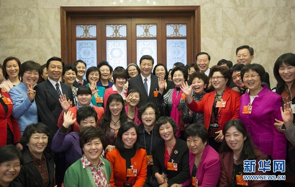 - 3月8日,中共中央总书记、中共中央军委主席习近平参加十二届全国人大一次会议江苏代表团审议。图为习近平同女代表合影。