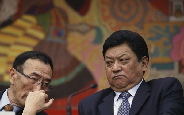 - 3月8日,北京,全国人大西藏代表团举行全体会议,审议政府工作报告,并对媒体开放。图为西藏自治区委员会副书记向巴平措(左)与自治区党委副书记、人大常委会主任白玛赤林交谈。
