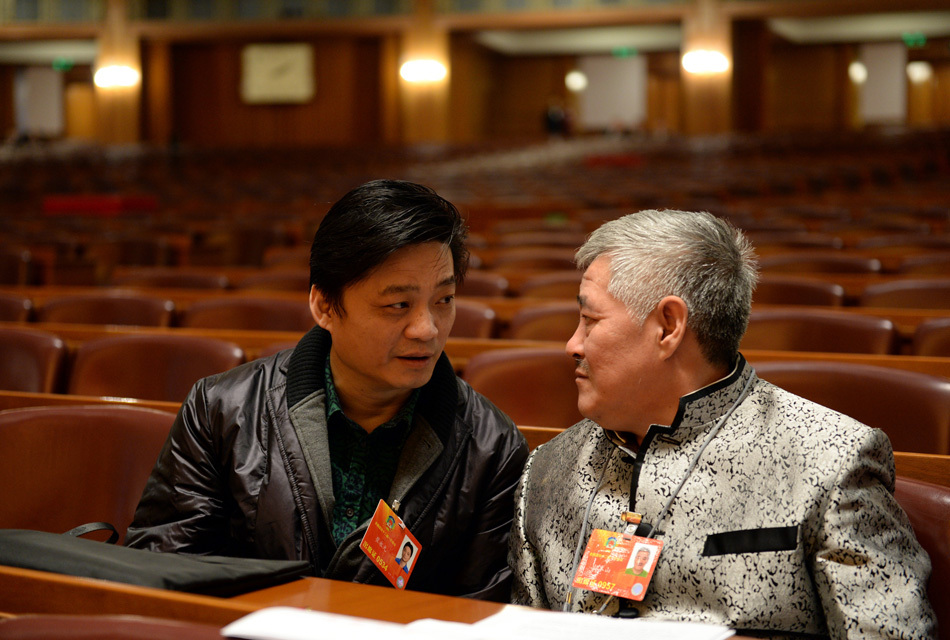 - 3月11日,全国政协十二届一次会议在北京人民大会堂举行第四次全体会议,选举产生政协第十二届全国委员会主席、副主席、秘书长和常务委员。这是提前到场的全国政协委员崔永元(左)和赵本山在会场内交流。