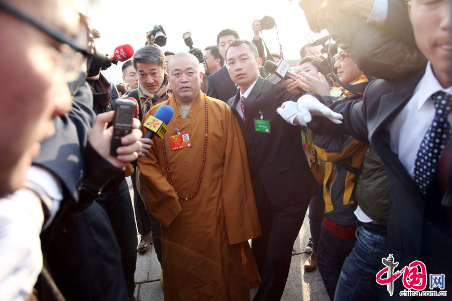 - 3月5日,第十二届全国人民代表大会第一次会议在北京人民大会堂开幕。前来人民大会堂参加开幕式的全国人大代表、少林寺方丈释永信在入场途中,遭到了各路媒体的疯狂围堵,面对记者们的频频发问,释永信始终笑而不语,一言不发。