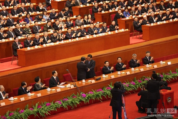 - 3月11日下午,全国政协十二届一次会议第四次全体会议在北京人民大会堂举行。图为贾庆林祝贺俞正声当选政协主席。