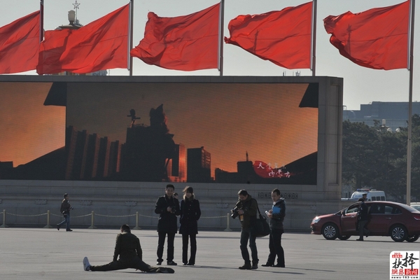 - 3月11日,全国两会召开期间,北京天安门广场红旗飘飘,一名男子表演劈腿秀。